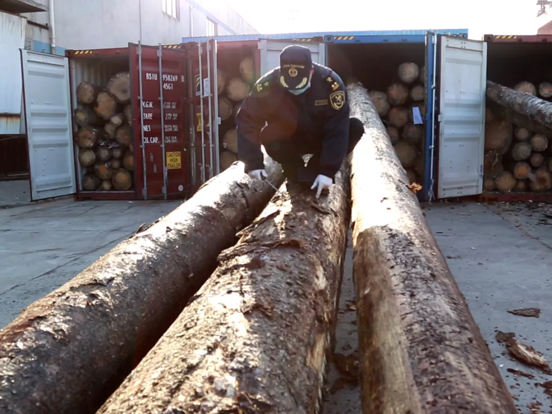圖為:鹽城海關關員對“滬豐通”搭載的進口木材進行檢疫查驗