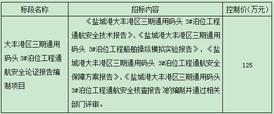大豐港區(qū)三期通用碼頭3#泊位岸線論證報(bào)告編制項(xiàng)目已經(jīng)相關(guān)部門批準(zhǔn)實(shí)施,項(xiàng)目所需資金來(lái)源自籌已落實(shí)。現(xiàn)對(duì)大豐港區(qū)三期通用碼頭3#泊位岸線論證報(bào)告編制項(xiàng)目進(jìn)行公開招標(biāo)。