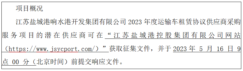 江蘇鹽城港響水港開發(fā)集團(tuán)有限公司現(xiàn)就江蘇鹽城港響水港開發(fā)集團(tuán)有限公司2023年度運(yùn)輸車租賃協(xié)議供應(yīng)商采購(gòu)服務(wù)項(xiàng)目征集供應(yīng)商,歡迎符合條件的供應(yīng)商參加本次框架協(xié)議采購(gòu)活動(dòng)。