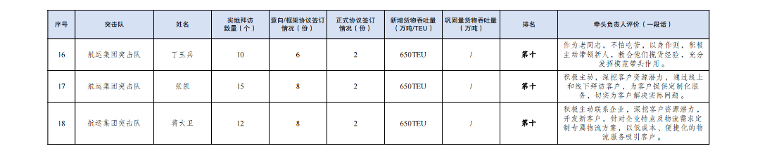 第三名:巾幗突擊隊 陳蒙(拜訪客戶184家,簽訂意向協(xié)議46份,簽訂正式協(xié)議2份,新增貨物吞吐量34TEU,鞏固量貨物吞吐量64TEU。