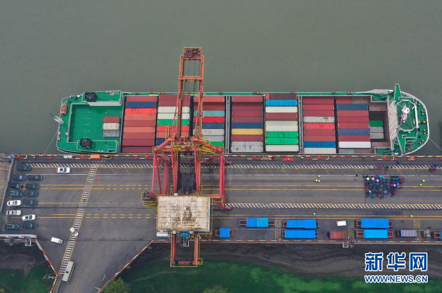 2月28日,停靠在碼頭的“漢海5號”準(zhǔn)備首航駛往上海洋山港(無人機(jī)照片)。新華社發(fā)(趙軍 攝)