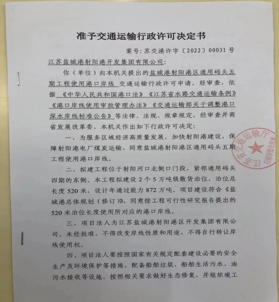 9月16日,鹽城港射陽(yáng)港區(qū)通用碼頭五期工程岸線取得江蘇省交通運(yùn)輸廳正式批復(fù)。截至目前,該項(xiàng)目前期工可報(bào)告、穩(wěn)評(píng)、通航安全技術(shù)報(bào)告、防洪評(píng)價(jià)、岸線全部通過(guò)批復(fù),這標(biāo)志著項(xiàng)目開(kāi)工正式邁入“快車(chē)道”。