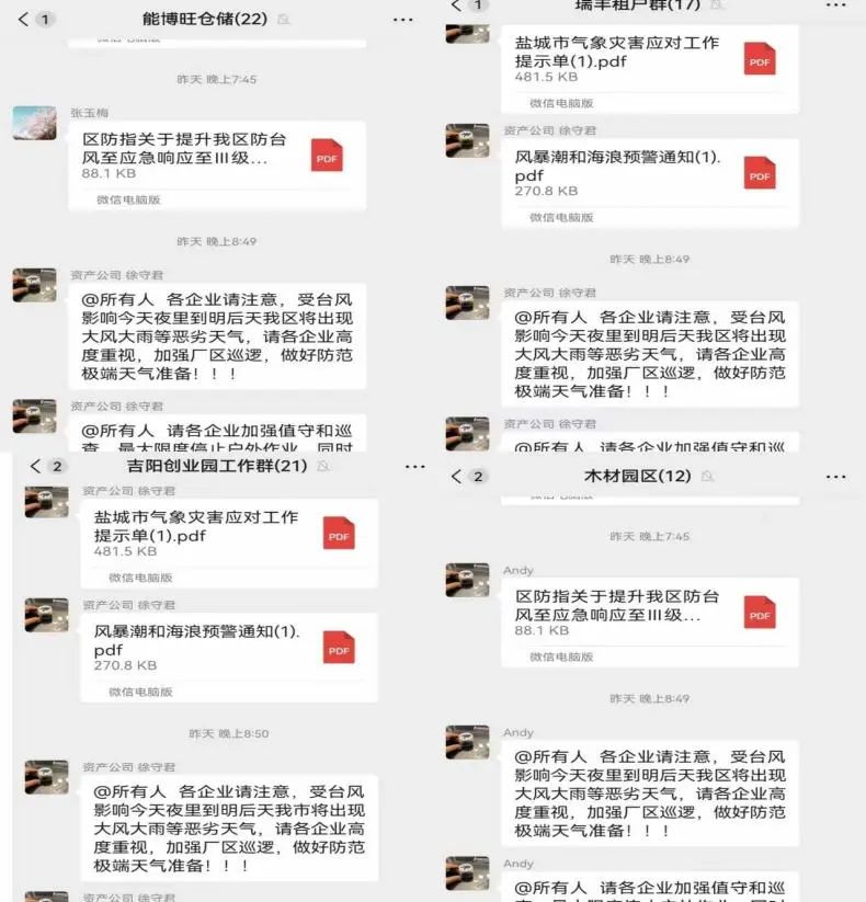 廣宣傳 強提醒。公司安全環保部密切關注臺風動向,加強預警預報,第一時間通過工作群轉發《鹽城市氣象災害應核對工作提示單》及各類預警信息,通過層層宣傳,擴大臺風預警范圍,一方面提示小區居民做好戶外物品收回、非必要不出門等安全防范工作;另一方面提高承租戶應對防御臺風的重視程度。