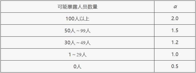 根據重大危險源所在港口企業作業區邊界向外擴展500米范圍內常住人口數量,設定暴露人員校正系數(α)值,見表3。