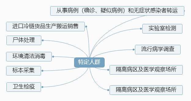 6.“特定人群”:在新冠肺炎疫情期間,從事病例(確診、疑似病例)和無癥狀感染者轉運、尸體處理、環境清潔消毒、標本采集、實驗室檢測、流行病學調查、隔離病區及醫學觀察場所、衛生檢疫、進口冷鏈貨品生產搬運銷售等工作的人群。