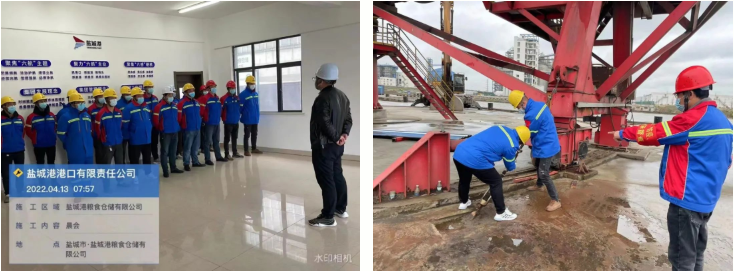 散貨碼頭分公司領導干部帶頭實施24小時值班制度,保障通訊暢通,及時掌握碼頭實時情況。維保人員全力將碼頭機械進行防風錨定,安全及設備人員復查確認,全面排查安全隱患,收回室外高空的積物,以防意外墜落,關閉好門窗,切斷機械設備電源,用強有力的手段應對惡劣天氣影響。