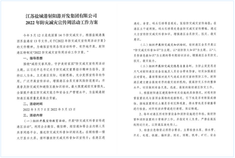 今年5月12日是我國(guó)第14個(gè)防災(zāi)減災(zāi)日,根據(jù)鹽城港集團(tuán)蘇鹽港安13號(hào)文件,關(guān)于《2022年防災(zāi)減災(zāi)宣傳周活動(dòng)方案》的文件精神,圍繞“減輕災(zāi)害風(fēng)險(xiǎn),守護(hù)美好家園”防災(zāi)減災(zāi)宣傳周活動(dòng)主題,以習(xí)近平總書記關(guān)于防災(zāi)減災(zāi)重要指示精神為指導(dǎo),堅(jiān)持以人為本,立足港區(qū)實(shí)際,廣泛開展宣傳周各項(xiàng)活動(dòng),增強(qiáng)港區(qū)全員災(zāi)害風(fēng)險(xiǎn)防范意識(shí),全面提升港區(qū)防災(zāi)減災(zāi)抗災(zāi)能力和安全生產(chǎn)管理水平。