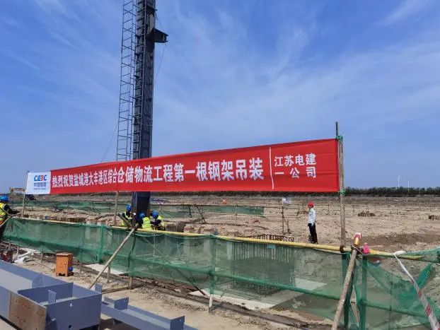 在機械及司號聲中,第一根預制鋼架被徐徐吊起,穩穩地安裝在承臺基礎上,由項目咨詢公司代管的大豐港綜合倉儲物流項目鋼結構工程首吊成功完成,標志著該項目正式進入安裝施工階段,開啟建設新篇章。