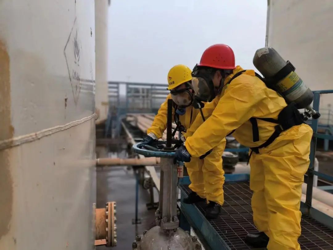 通訊警戒組在安全區(qū)域拉起警戒線,救援組迅速穿戴防護(hù)用品,緊急切斷TK102閥門。