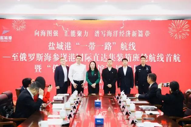 4月21日,鹽城港“一帶一路”航線—至俄羅斯海參崴港國際直達集裝箱班輪航線首航暨“俄羅斯國家館”授牌儀式成功舉行。鹽城港集團副總經理袁欣,俄羅斯聯邦政府經濟發展部、農業部俄羅斯出口中心國家館負責人羅曼諾夫·伊利亞·安德烈維奇,俄羅斯聯邦政府自然資源和生態部鎳礦出口負責人科里尼卡夫·葉甫蓋尼·斯捷巴諾維奇,鹽城大豐海事處處長朱龍錦,鹽城海關駐大豐港辦事處副主任朱天樂,鹽城出入境邊防檢查站邊檢處副處長張偉,海鐵聯捷公司海運事業部總監蒯霞、香港公司經理楊森,江蘇俄貨寶國際物流公司執行董事史素華出席活動。鹽城港航運集團、大豐港開發集團、保稅物流中心、糧食物流園相關負責同志等參加。