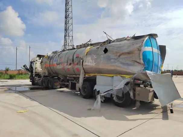 根據現場險情,公安交警部門第一時間封鎖事故現場,禁止一切車輛靠近,消防大隊出動消防車對事故車輛罐體進行噴射冷卻,聯系吊車對其進行罐體扶正工作,隨后由?;愤\輸公司救援搶險隊使用相關設備將泄漏罐車內的“高沸點芳烴”進行抽取,并轉移至指定安全區域。