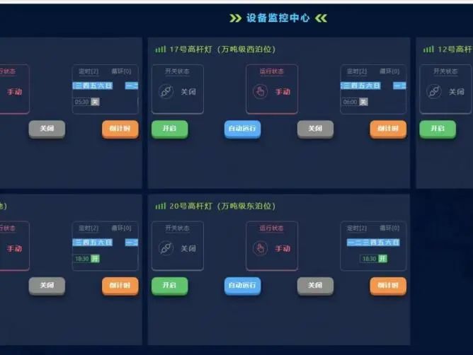 為深入貫徹國家“雙碳”目標,射陽港區(qū)聚焦節(jié)能降耗、高效運行為抓手,利用4G遠程模塊聯(lián)動PC端或微信小程序,實現(xiàn)港區(qū)高桿燈照明系統(tǒng)的集中控制管理,根據(jù)生產(chǎn)需求合理開關(guān)作業(yè)區(qū)域高功率燈具,既降低了人工煩瑣操作,又有效降低電力消耗減少能源浪費,延長燈具的使用壽命。據(jù)了解,港區(qū)20桿高桿燈,每日開啟平均約8桿高桿燈,每年可節(jié)約電量103680KWh,節(jié)約電費8萬余元,經(jīng)濟效益顯著。