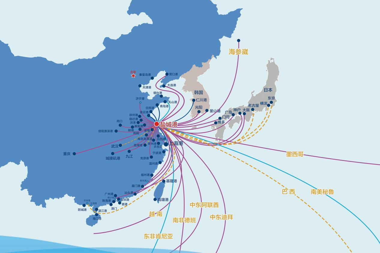 鹽城港集團成立之初,便將航線開辟作為重要任務,以“做優內河、主攻近海、加密近洋、探索遠洋”為航線開辟思路,全力構建全方位、多層次、寬領域的航線網絡。五年來,在集團不懈努力下,鹽城港航線版圖不斷拓展,從寥寥數條到縱橫四海,實現了跨越式發展。