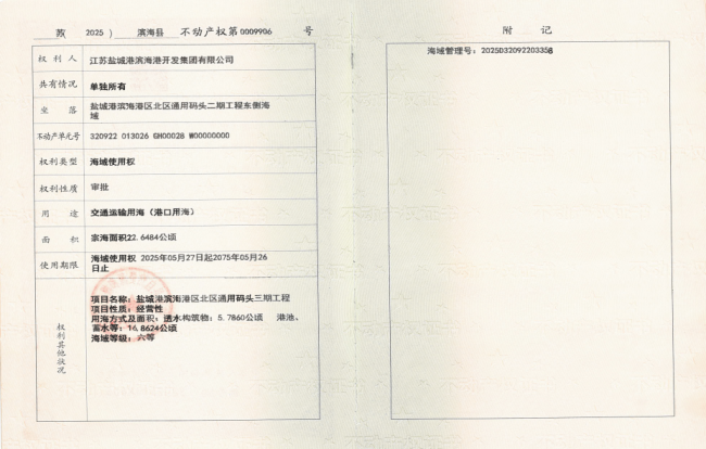 此次海域使用證的獲批,標志著濱海港區北區通用碼頭三期工程在建設進程中邁出了堅實一步,也為鹽城港的發展注入了新活力,助力其在區域經濟發展中發揮更大作用。