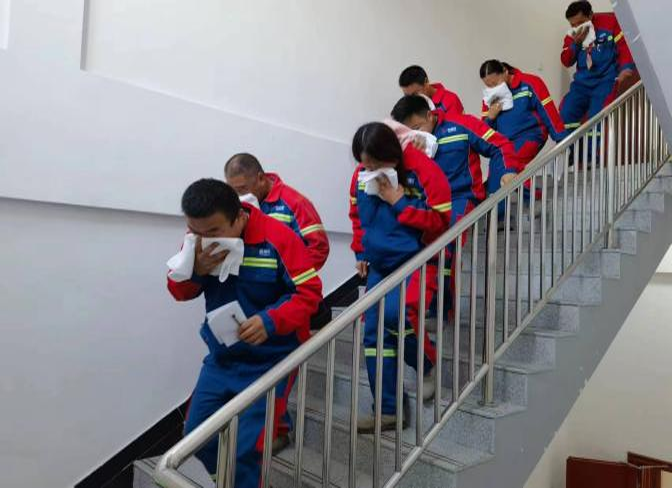 本次演練模擬綜合樓辦公區域突發“火情”、大量濃煙蔓延的情況,消控室接到煙感報警器報警后迅速準確地將火警信號傳遞到各樓層,滅火組、搶險救護組、后勤保障組等聞聲而動,關閉電源、迫降電梯、疏散職工、救護傷員等各項應急工作迅速進行落實。大家彎腰貓步、捂住口鼻,有序從就近樓梯出口疏散到“安全區域”。負責人員第一時間組織現場自救與互救,將傷者運送到指定安全區域,撥打120急救中心電話,組織人員進行臨時看護和臨時性的心理疏導。