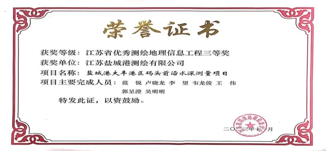 近日,江蘇省測繪地理信息學會公布2023年度江蘇省優(yōu)秀測繪地理信息工程獲獎名單,鹽城港大豐港區(qū)碼頭前沿水深測量項目榮評2023年度江蘇省優(yōu)秀測繪地理信息工程三等獎。