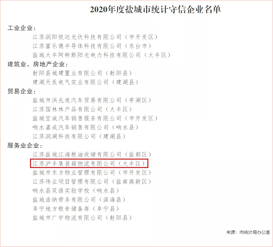 近日,通過嚴格審核,鹽城港滬豐集裝箱公司被鹽城市統(tǒng)計局評為“2020年度統(tǒng)計守信企業(yè)”,充分體現(xiàn)了滬豐公司重視和加強誠信管理體系建設所作出的努力,對塑造公司誠信經(jīng)營形象、提升物流市場競爭力具有重要意義。