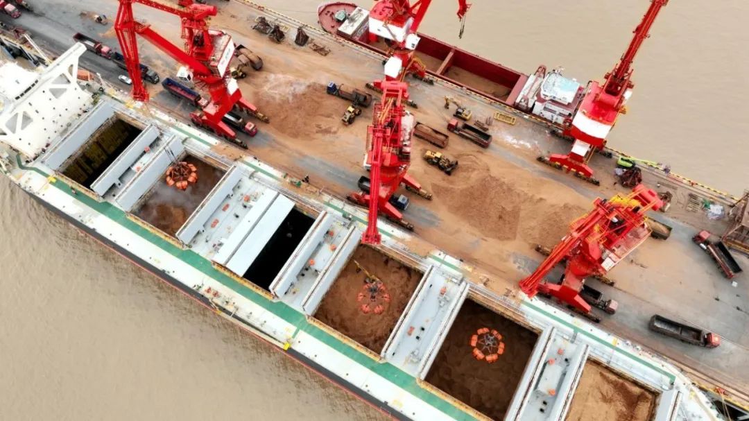 開始作業前,通用碼頭分公司上下躊躇滿志,堅決打響新年“第一響”,統籌安排船舶調度,優化作業流程和裝卸計劃,對作業模式、碼頭設備保障和人力儲備進行詳細安排。作業過程中,三臺門座式起重機用整齊劃一的卸貨動作詮釋著“專業”“精良”“高效”,同時作業人員主動對接生產指揮中心、物流公司等多個部門和單位,全面壓縮非生產停時,最大限度提質增效,在全員共同努力下,通用碼頭分公司以穩定高效的作業能力圓滿完成本次作業任務。據統計,本次單船作業用時78小時,單船效率達633.4噸/小時,同比上漲15%,單班最高產量達8774.46噸,同比上漲12%,晝夜最高產量達16198.68噸,同比上漲6%,勇破四項生產紀錄,完美完成首戰“開門紅”。